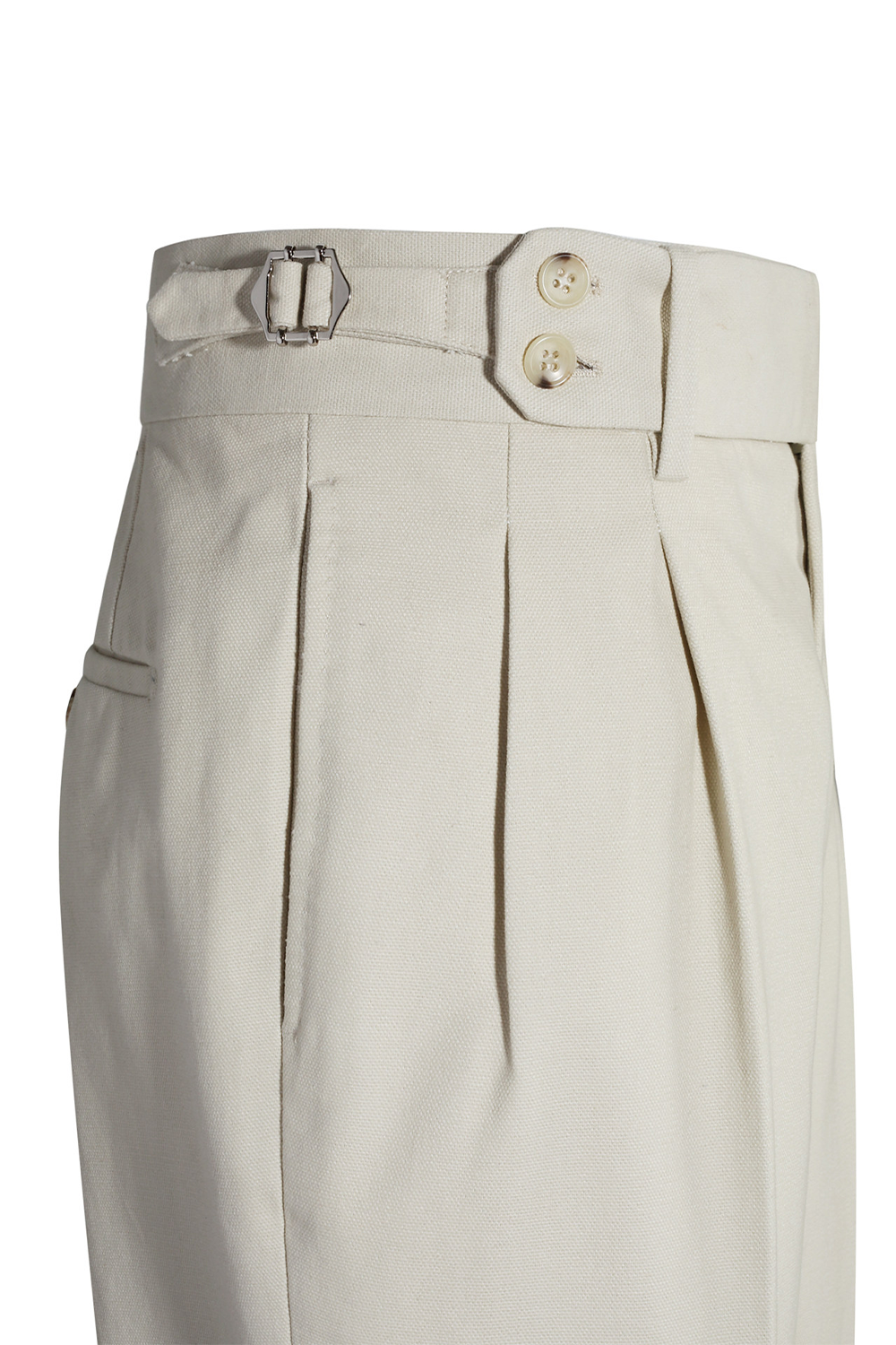 Calça em modelagem italiana 100% algodão, pregas, cintura alta, com ajustadores laterais - Off White GVC